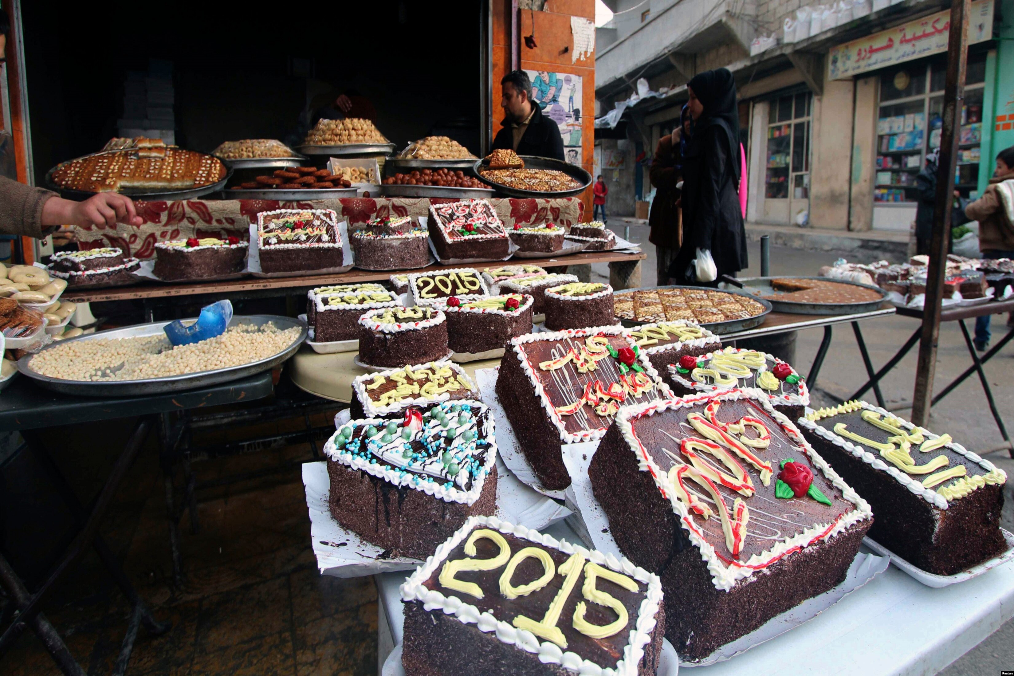 | Bánh mừng năm mới bày bán bên ngoài một cửa hàng ở khu phố Sheikh Maksoud của thành phố Aleppo, Syria, ngày 31 tháng 12, 2014. |