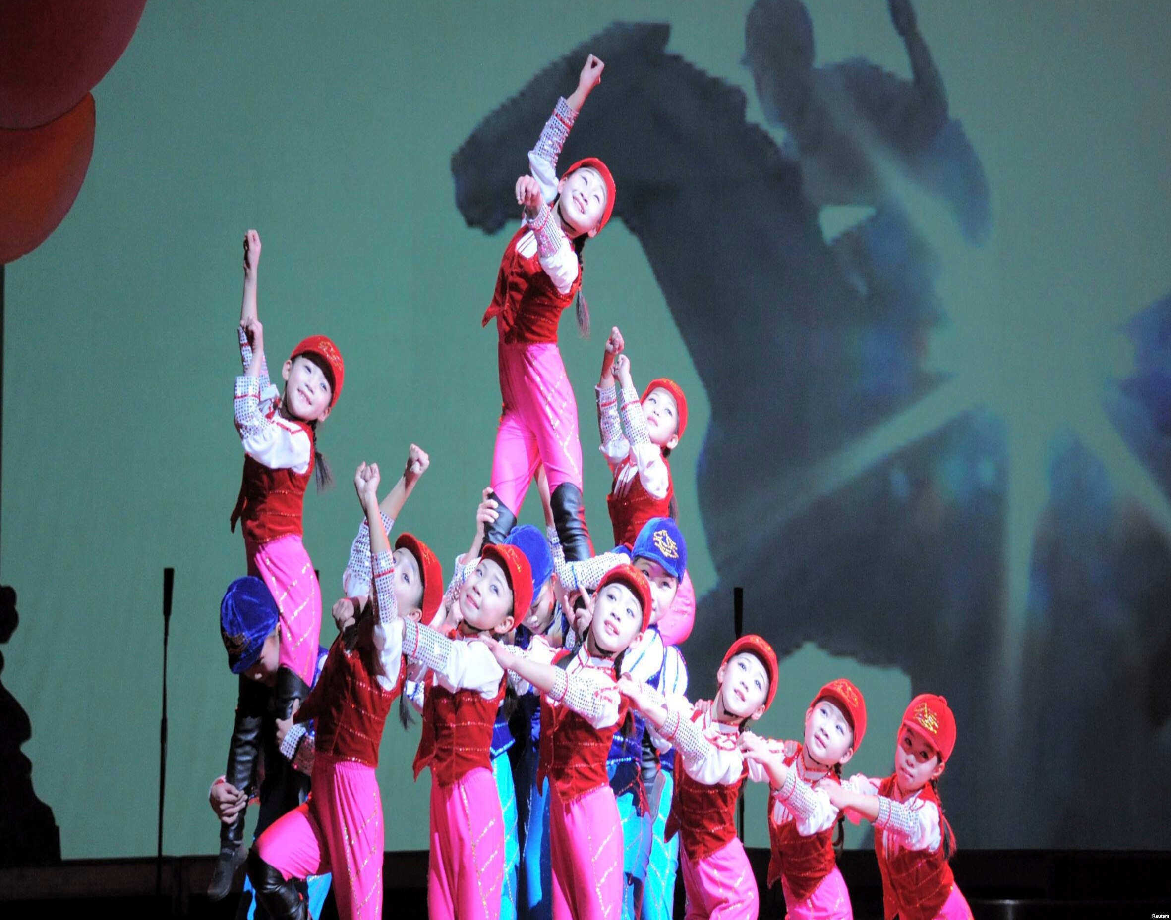 | Trong bức ảnh do Thông tấn xã Trung ương Bắc Triều Tiên công bố, những em học sinh biểu diễn tiết mục "Chúng ta hạnh phúc nhất thế giới" đón mừng năm mới ở Bình Nhưỡng, ngày 31 tháng 12, 2014 |