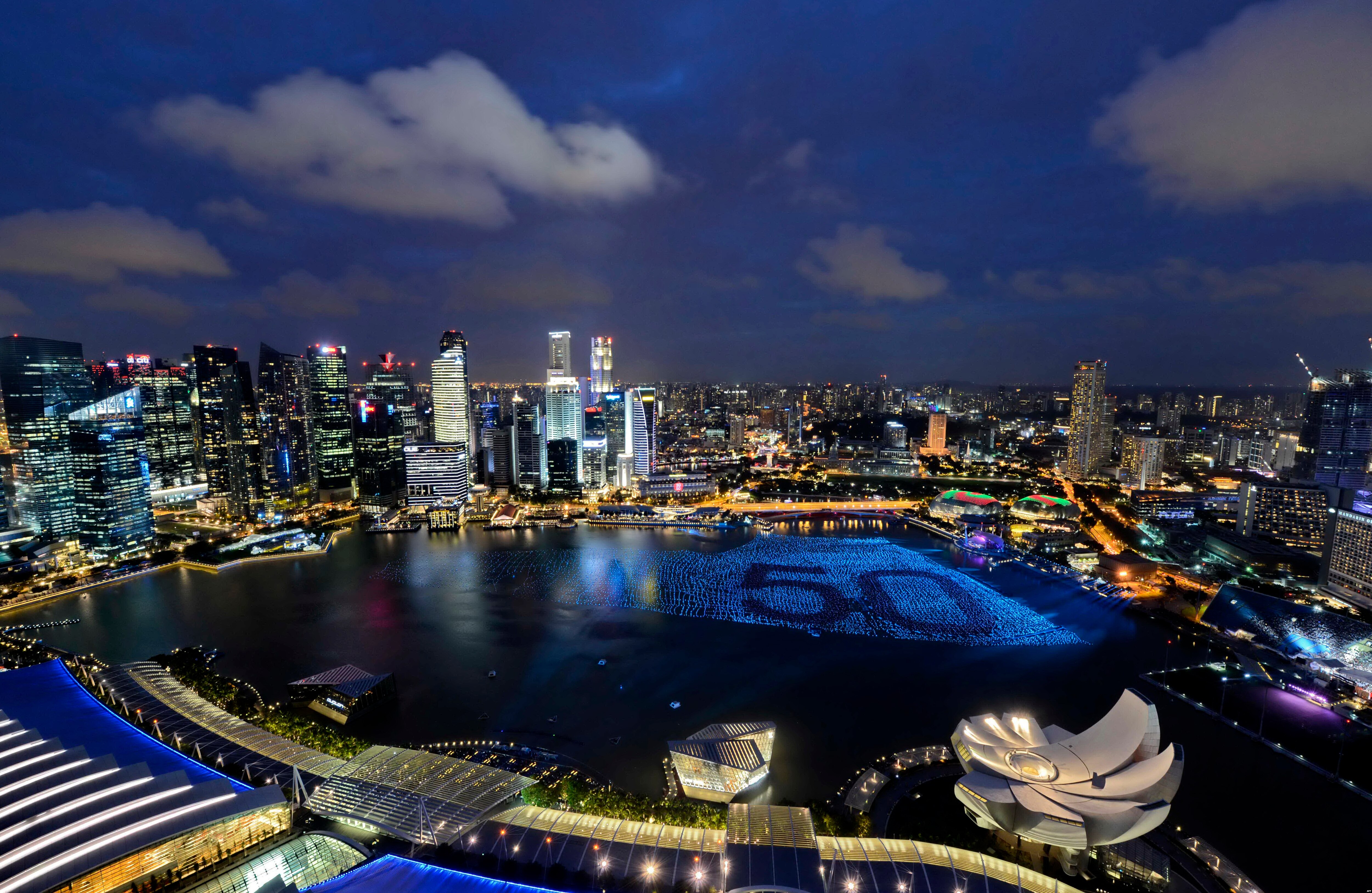 | Những khối cầu đặt trong Vịnh Marina tạo thành số '50' để đánh dấu kỷ niệm 50 năm thành lập nước Singapore vào năm 2015, ngày 31 tháng 12, 2014. |